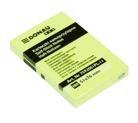 Univerzální samolepicí bloček s lepicím pruhem. Lepidlo na vodní bázi. Neutrální žlutá barva papíru je ideální pro poznámky a vzkazy. Rozměr: 51x76 mm. Počet poznámkových lístků: 100. Gramáž papíru: 70 g/m² ± 4%. Z recyklovaného papíru, vynikající lepicí schopnost.