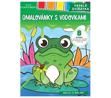 Omalovánky s vodovkami obsahují 8 veselých obrázků s motivem veselých zvířatek. Každý obrázek má v dolní části 6 vodových barev (červenou, oranžovou, žlutou, modrou, zelenou a fialovou). Balení obsahuje také malířský štětec. Omalovánky mají formát A4.